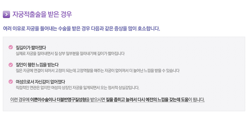 • 자궁을 보전하고 싶은 여성의 경우 질임플란트를 이용하여