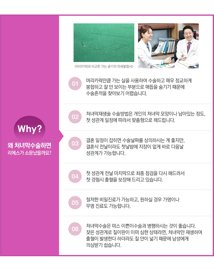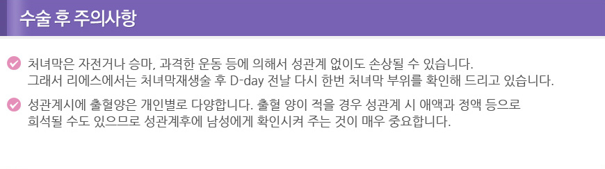 결혼할 남자가 정말 순진해서 총각인 것 같다든지 남자 측 집안 분위기가 보수적이고 엄격해서 내가 처녀가 아니라면 왠지 모르게 흠집 잡힐 것 같고 남자에게도 미안해지는 경우가 있습니다. 처녀막재생술은 결혼 전에 심적으로도 자신감을 드립니다.