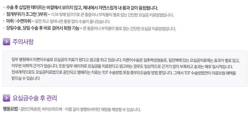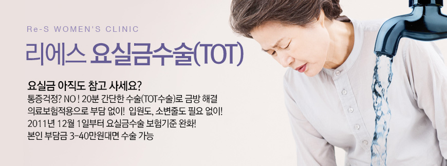 복압성 요실금의 경우 수술만이 유일한 치료법이며, TOT 수술법(경폐쇄공 테이프)이 전세계적으로 시행되고 있는 공인된 확실한 치료 방법입니다.