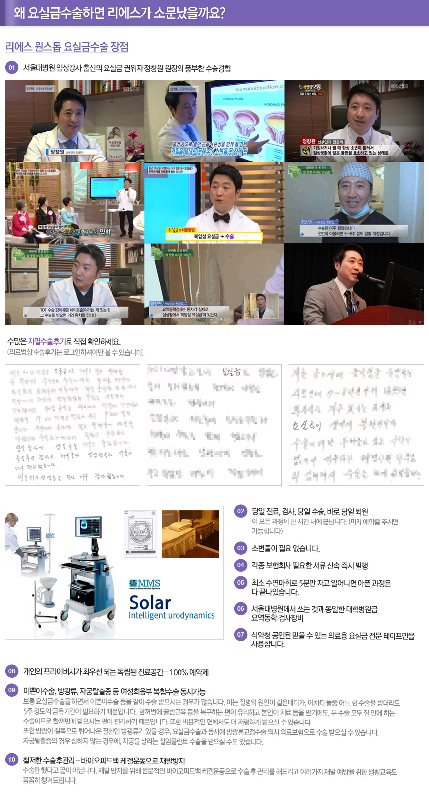 요실금을 이쁜이수술로 치료할 수 있다고 광고를 많이 하고 있는데요, 사실은 그렇지 않습니다 복압성 요실금의 공인된 치료법은 TOT 수술방법뿐입니다. 이쁜이수술은 질후벽 수술이기 때문에 질전벽에 있는 요도에 치료효과는 매우 제한적입니다. 과거에 요실금 치료로 질전벽 수술을 시행했었으나 그나마도 재발율이 높기 때문에 요즘에는 시행하지 않고 TOT 수술을 전세계적으로 시행하고 있거든요. 다만 골반근육을 많이 당길경우 아주 약한 요실금의 경우 일시적 호전이 오는 수가 있습니다.