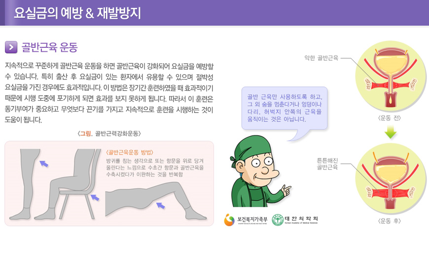 여러 가지 원인에 의해 발생하는 요실금은 원인에 따라 적절한 치료가 가능합니다. 따라서 요실금을 나이가 들어서 생기는 당연한 현상으로 받아들이고 치료가 필요 없거나 불가능하다고 여기는 것은 잘못된 생각입니다.