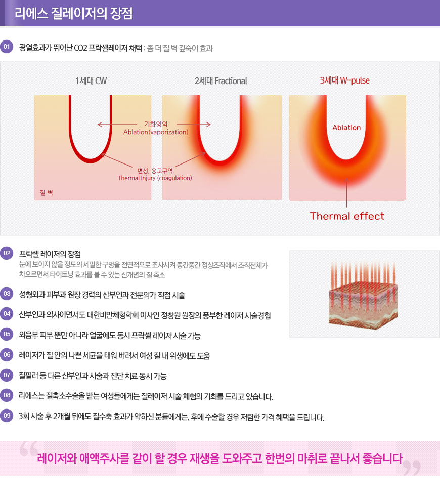 레이저 질타이트닝은 질 전체 내부를 360도 돌아가며 고르게 레이저를 조사해 줌으로써, 질 내부가 젊고 건강한 조직들로 재생됩니다. 또한 질 점막하 콜라겐 합성을 자극하여 질 벽을 수축시키는 시술입니다. 쉽게 생각하면 오징어를 불로 구우면 쪼그라드는 원리를 연상하시면 됩니다. 인티마 레이저, 모나리자 터치 등이 모두 질레이저의 일종입니다. 피부에 레이저를 받으면 피부가 좋아지듯이, 질 내에도 질 점막이 재생되고 질 벽에 탄력이 생깁니다. 질건조증, 여성불감증에도 도움이 될 수 있습니다.